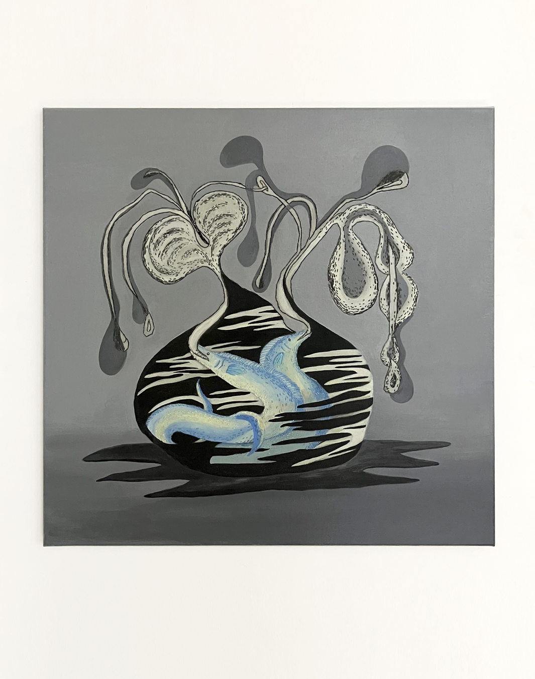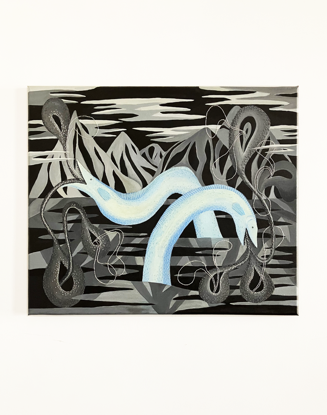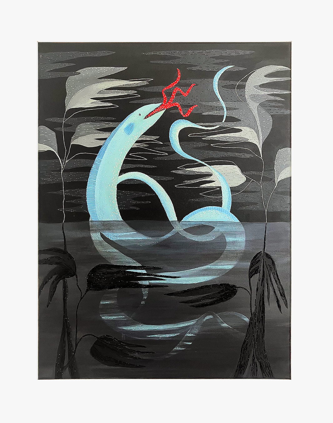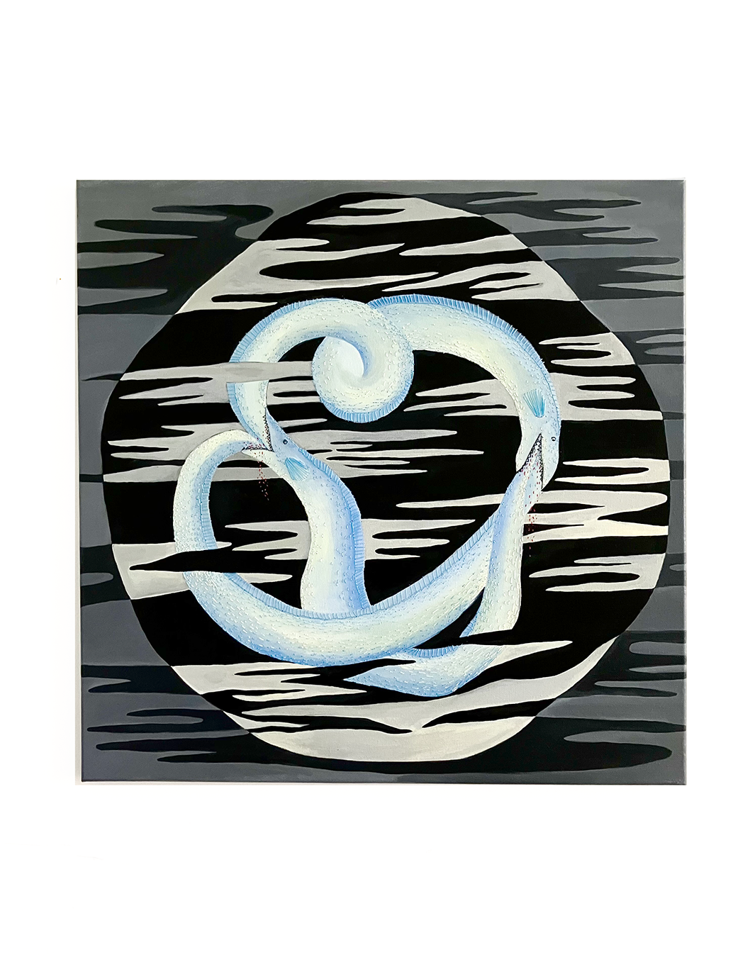 The Feeding explores two serpents bound in mutual dependence, each requiring the other for survival. Born of the same womb, they reflect the dynamics of siblinghood that involve play, rivalry, and the desire for independence. Acrylic and embroidery intertwine to express connection and destruction.